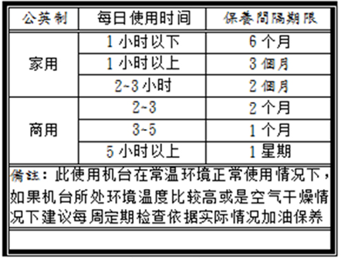 依使用之頻率不同,建議對照下方之附表時(shí)間,使用潤滑油來潤滑跑步板.